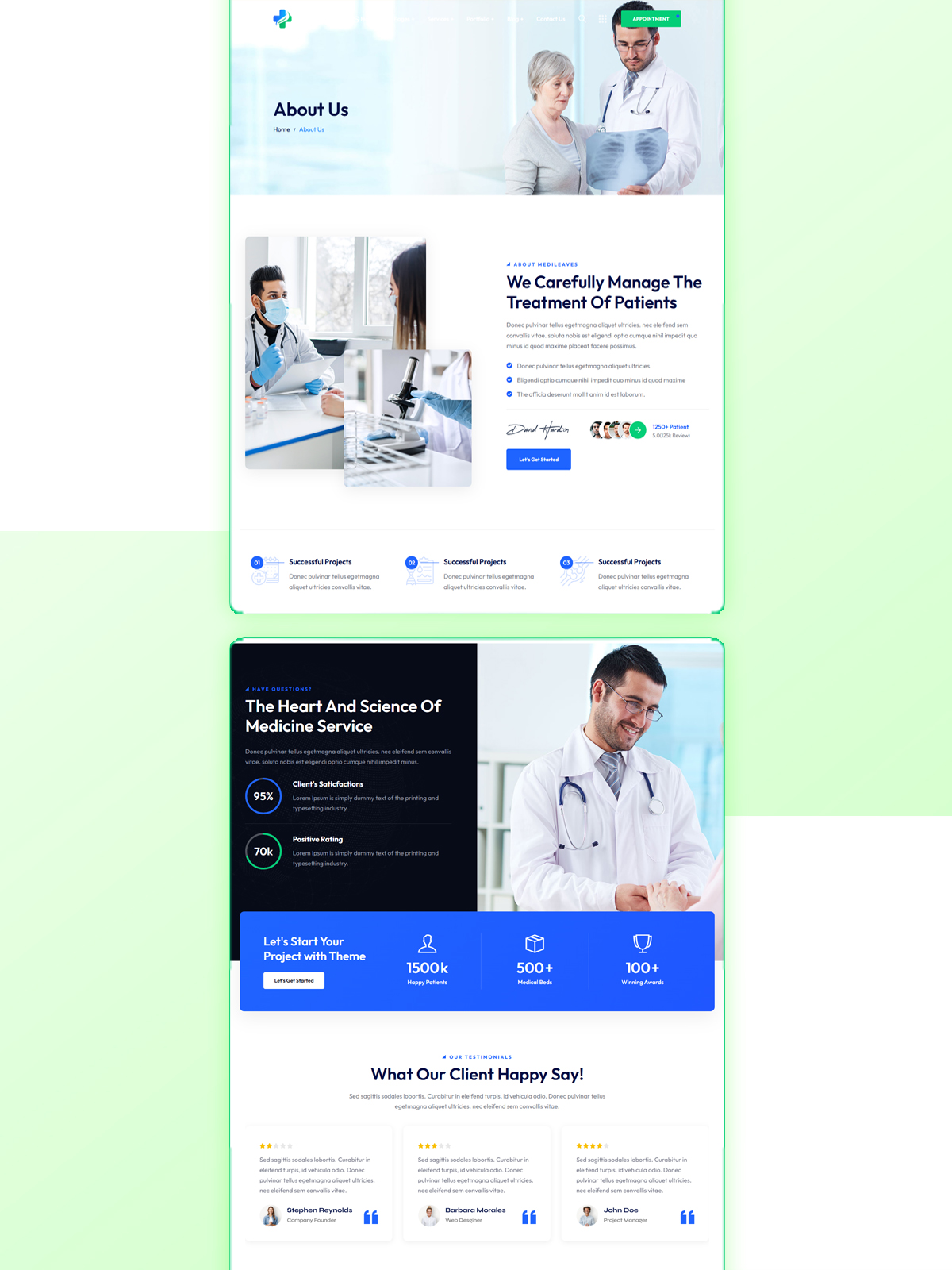 Home Page – Clean and visual homepage with trust-building elements like a featured doctor hero section, stats (successful treatments, years experience), highlighted services, and “Make Appointment” CTA buttons.