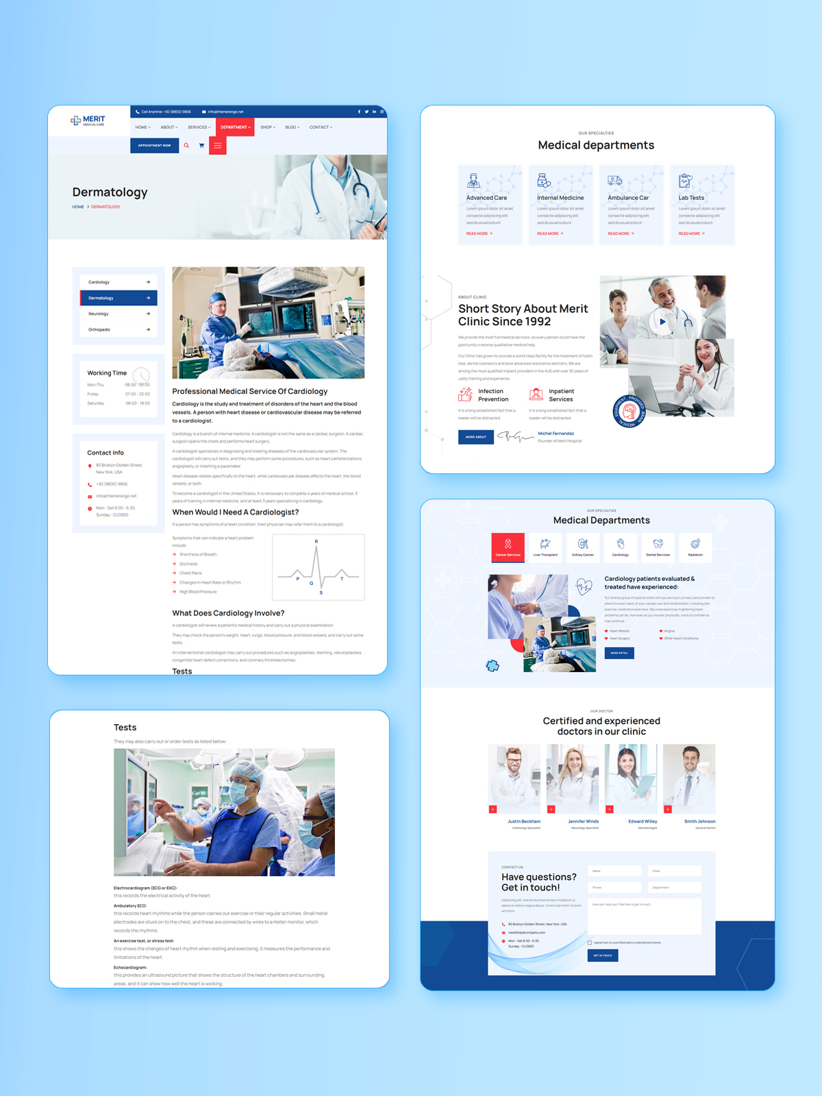 Departments Page – Dedicated grid-style department directory (e.g., Cardiology, Dermatology, Orthopedic) with imagery, icons, and short descriptions for each specialty. Easy for visitors to explore specific care areas.